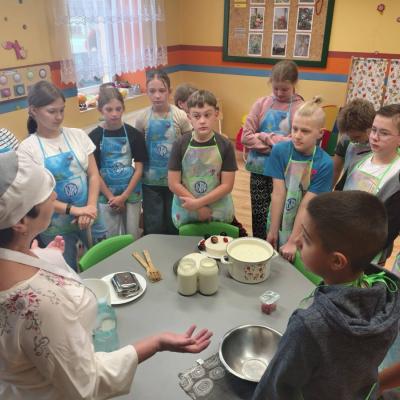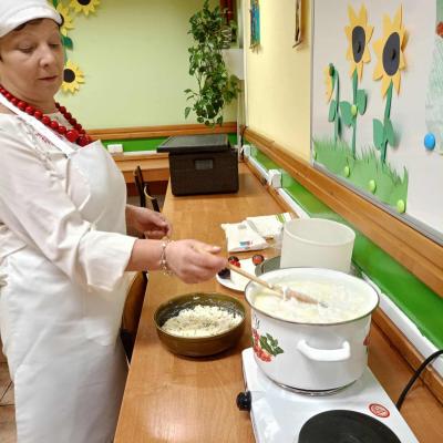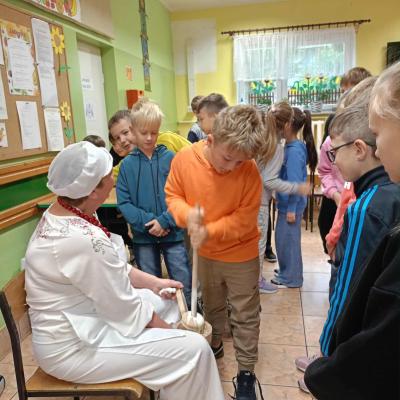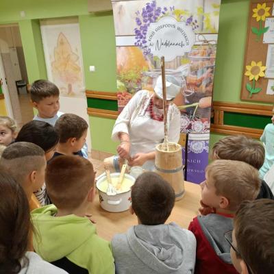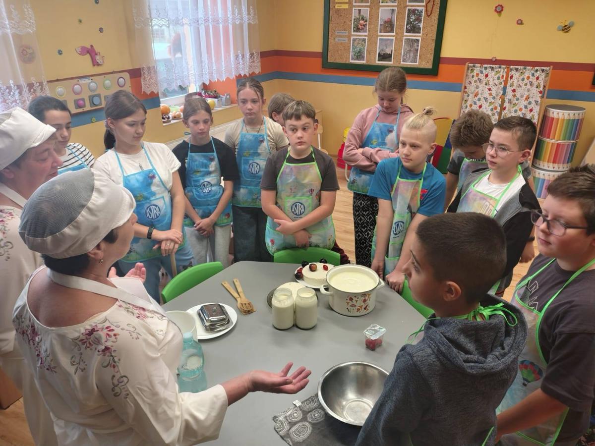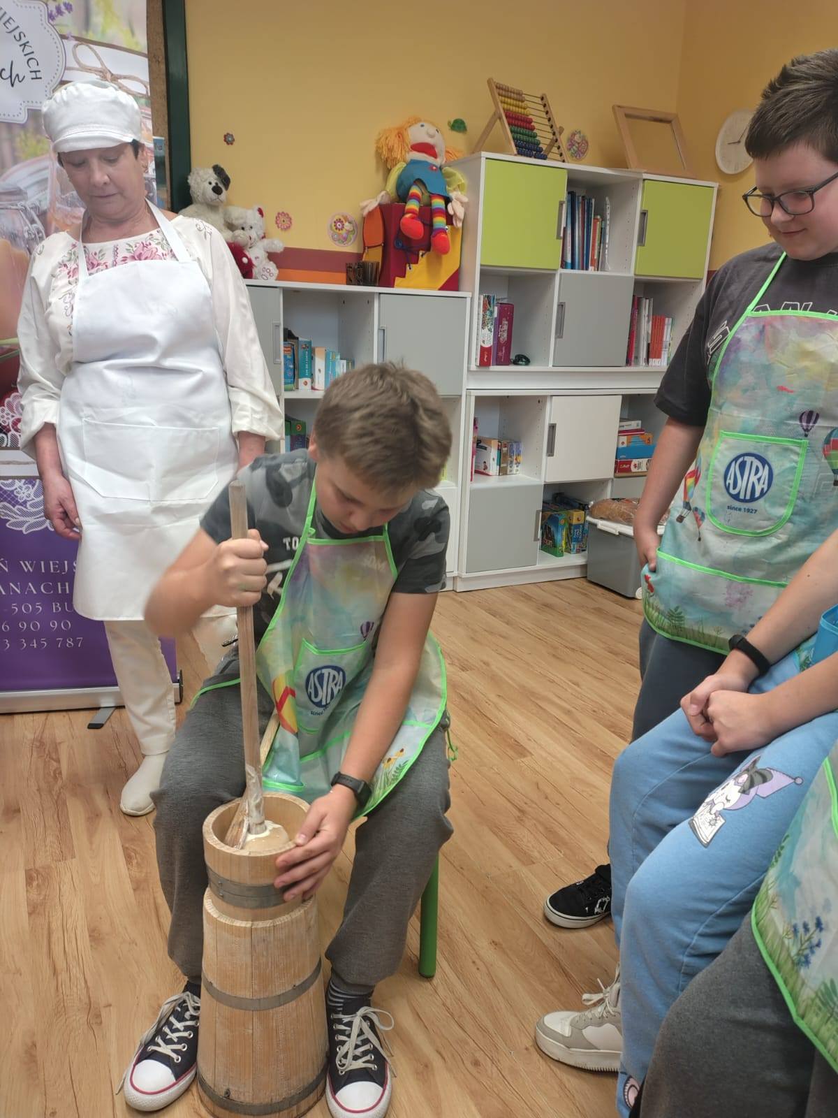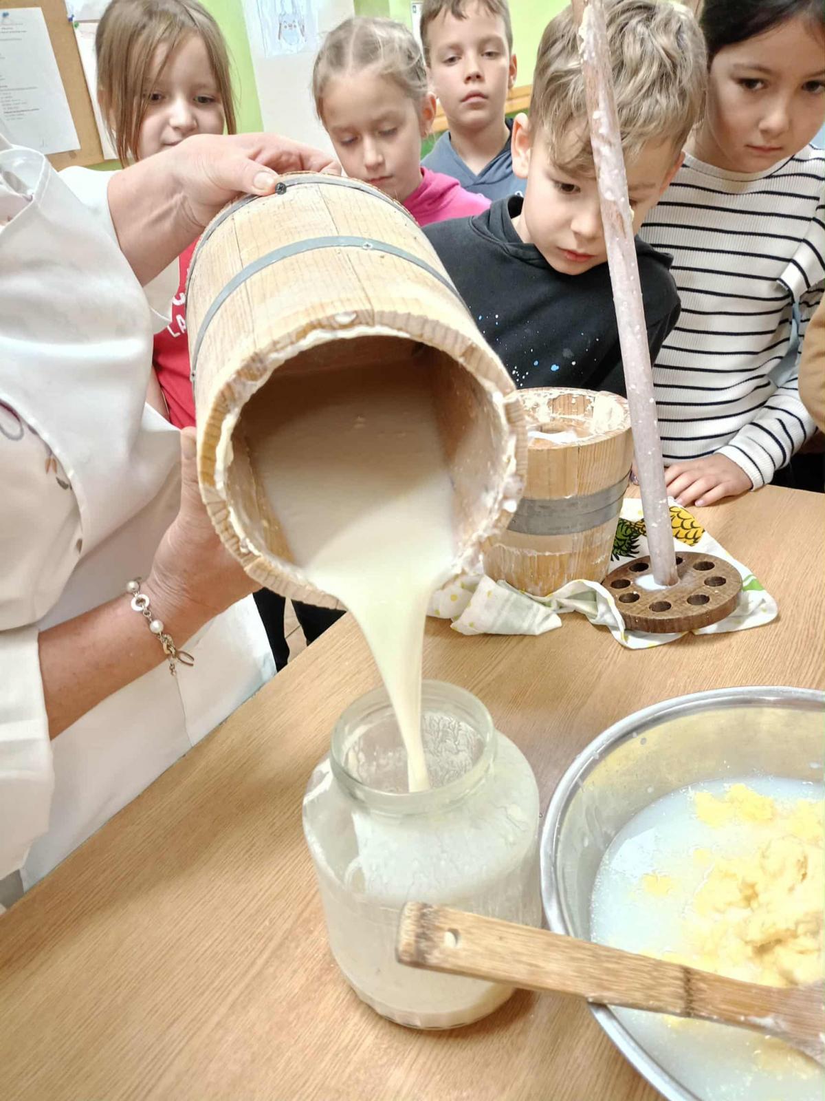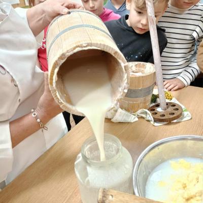Podczas zajęć dzieci wyruszyły w kolejną smakowitą podróż do przeszłości, poznały tradycyjne metody wyrabiania masła i sera, takie, jakie dawniej stosowano w wiejskich gospodarstwach. Pod czujnym okiem prowadzącyc uczestnicy sami ubijali śmietanę w maselnicy, obserwując, jak z prostych składników powstaje prawdziwe, złociste masło. Uczyli się też, jak powstaje domowy ser, naturalny, pachnący i pełen smaku.