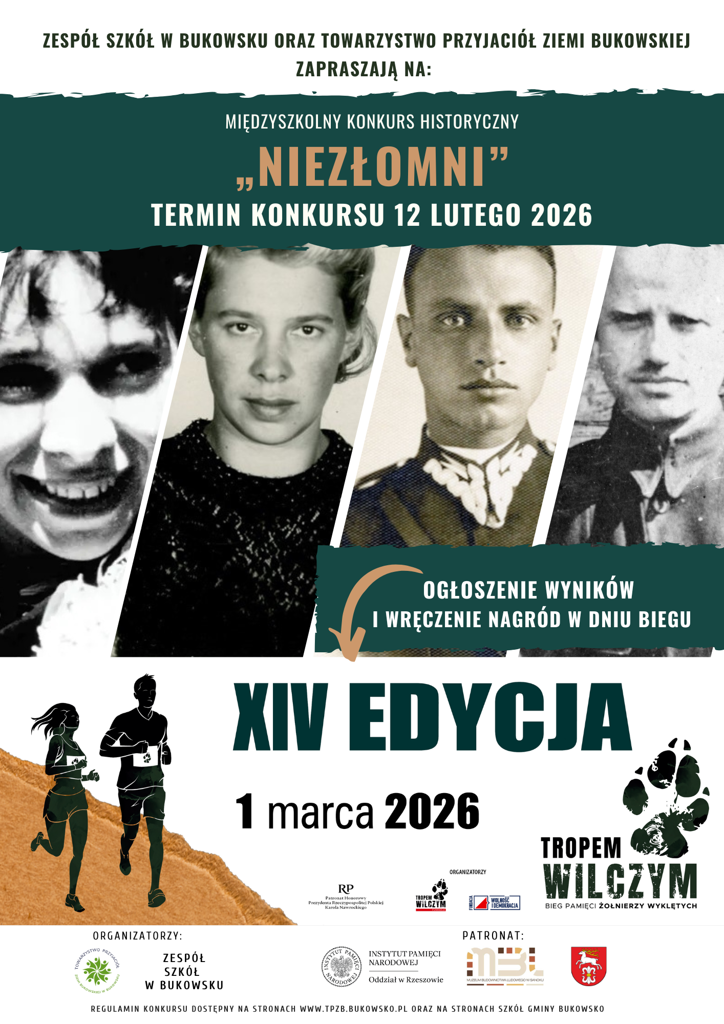 Jak co roku zapraszamy serdecznie zespoły młodzieży ze szkół gminy Bukowsko do udziału w miedzyszkolnym konkursie historycznym "Niezłomni". W tym roku ze względu na termin Biegu przypadającego dokładnie w dniu obchodów Nadodowego Dnia Pamięci Żołnierzy Wyklętych planujemy współniez gminą Bukowsko gminne obchody tego święta.