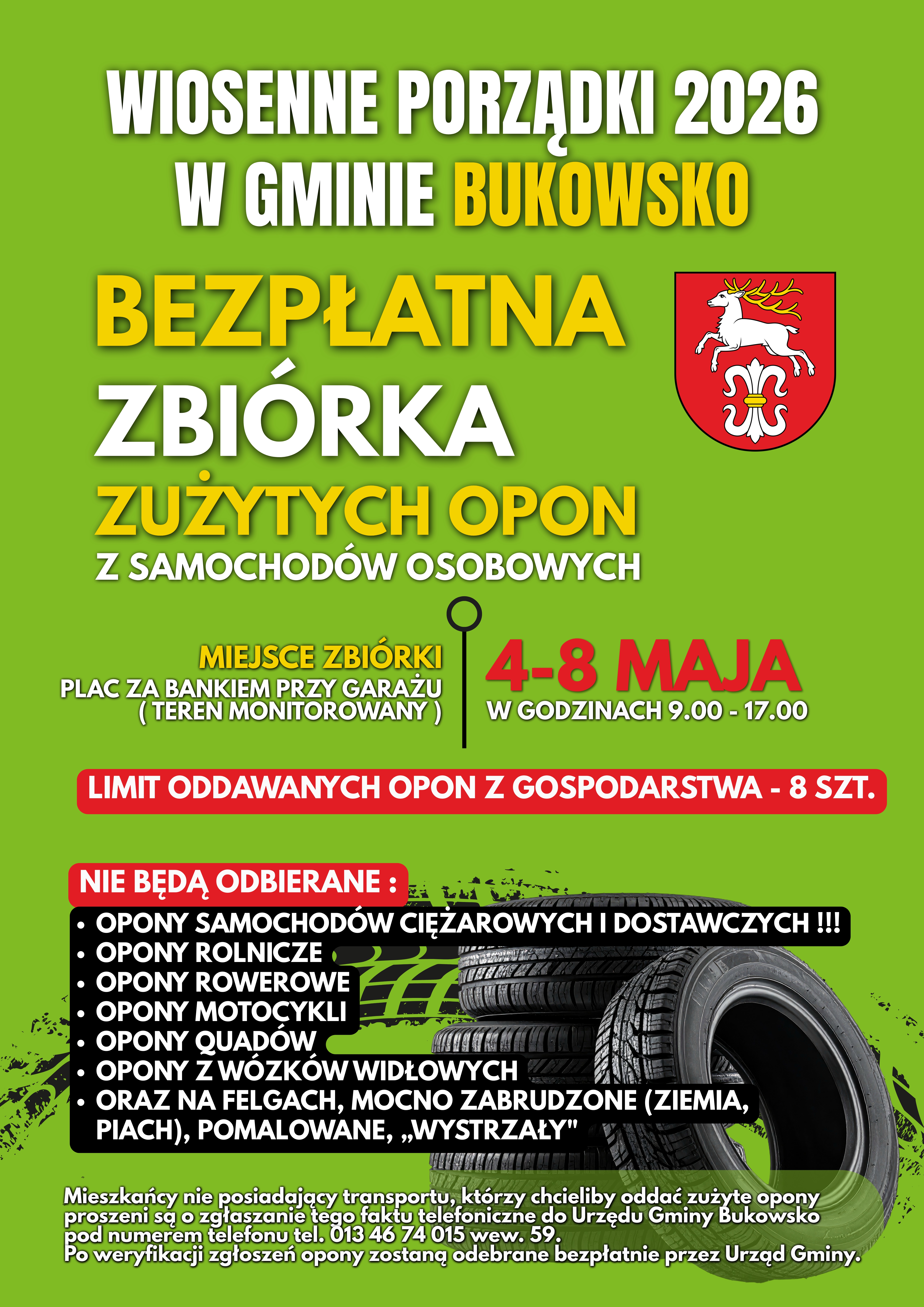 Mieszkańcy nie posiadający transportu, którzy chcieliby oddać zużyte opony proszeni są o zgłaszanie tego faktu telefoniczne do Urzędu Gminy Bukowsko pod numerem telefonu tel. 013 46 74 015 wew. 59. Po weryfikacji zgłoszeń opony zostaną odebrane bezpłatnie przez Urząd Gminy.